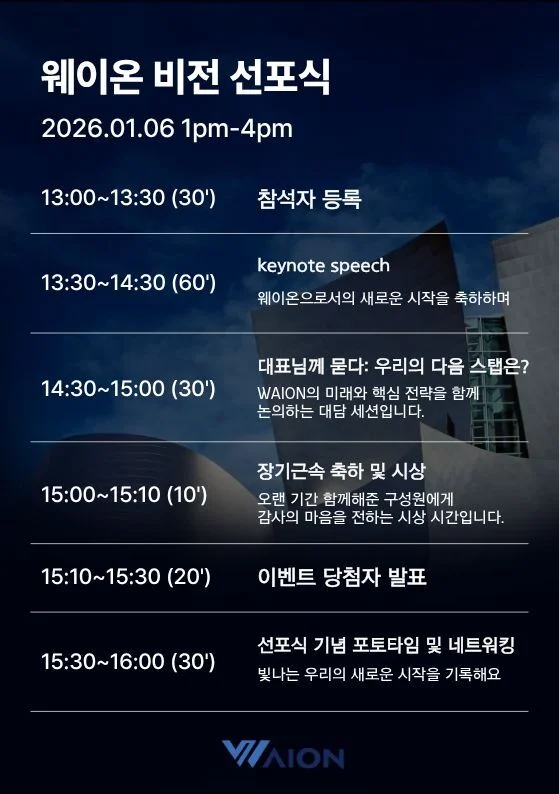 핵심 주제: 새로운 사명 ‘웨이온(WAION)’ 출범, 비전 및 전략 공유, 조직 문화 결속