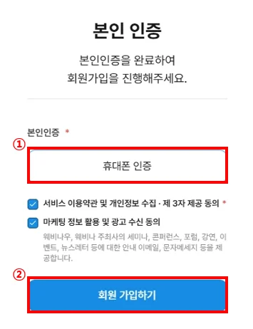 3. 휴대폰 인증 후 회원 가입하기 버튼을 누르면 간단하게 회원 가입이 완료됩니다.