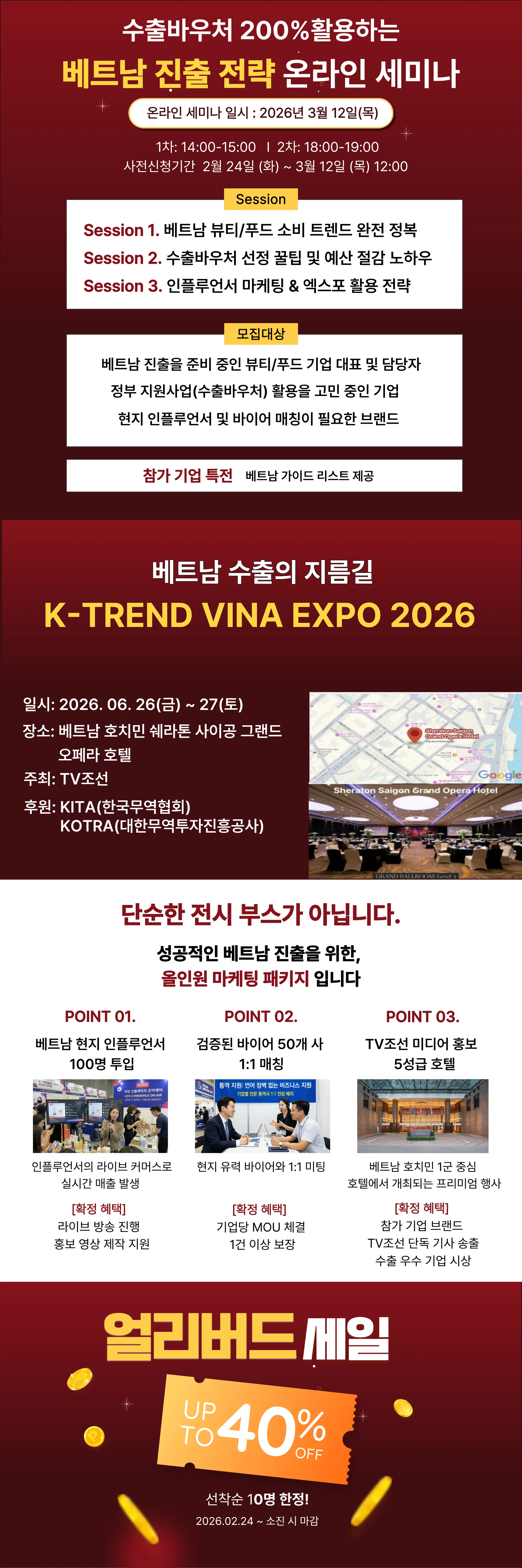 🚨 EXPO 얼리버드 세일 진행 중: K-TREND VINA EXPO 2026 참가를 원하시는 기업을 위해 UP TO 40% OFF 혜택을 제공합니다. (선착순 10명 한정, 소진 시 마감)