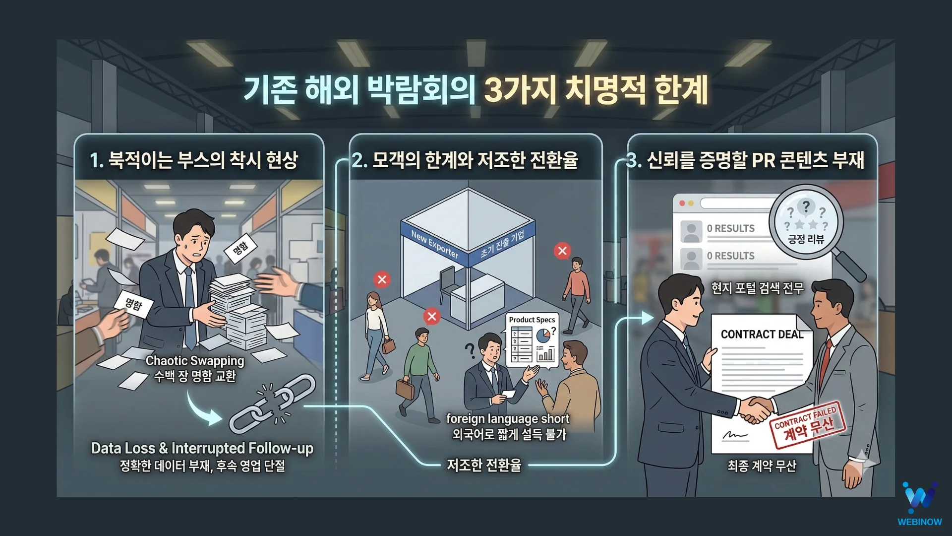 기존 박람회의 한계: 무의미한 명함 교환, 저조한 모객, 신뢰할 수 있는 PR 기사의 부재로 인해 실제 계약으로 이어지기 어렵습니다.