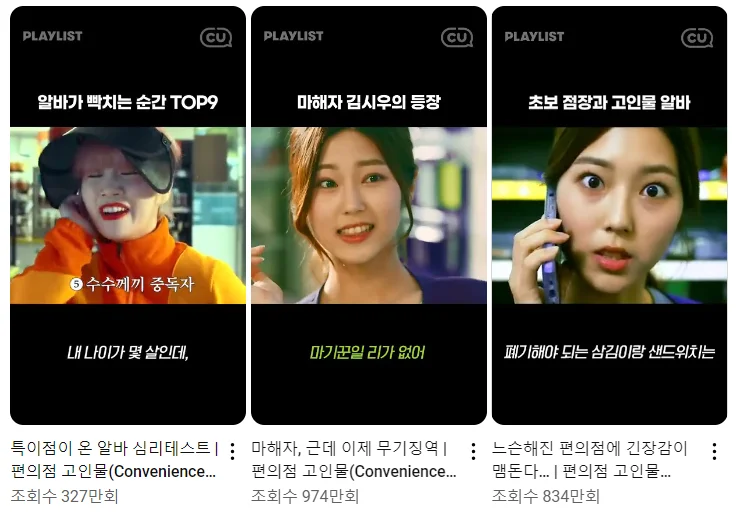 편의점 프랜차이즈 CU는 유튜브 공식 계정을 통해 편의점을 배경으로 한 숏폼 콘텐츠를 공개하고 있습니다.