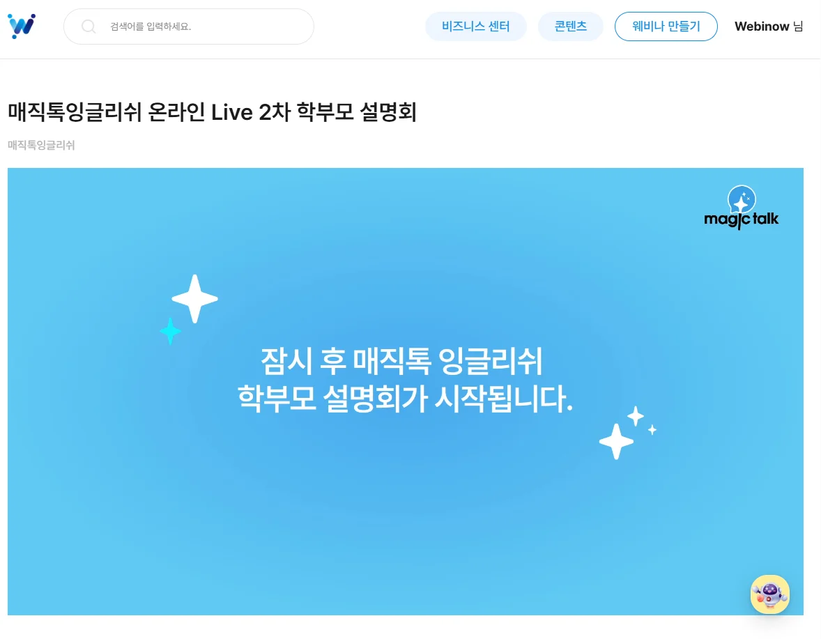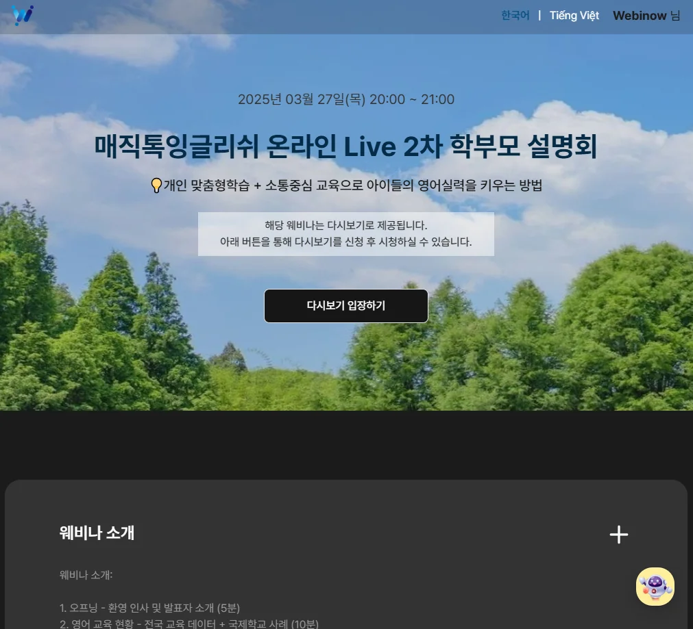 웨비나를 개설하면 작성한 내용을 바탕으로 해당 웨비나만의 페이지가 개설됩니다.